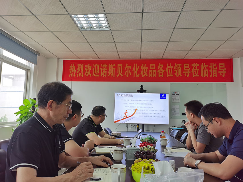 2020年9月11日,为了加强相互间的了解,加强加深合作,诺斯贝尔化妆品有限公司的研发总监彭心宇先生和技术工程师瞿德成先生来到我公司参观考察,公司董事长宁海金先生、总经理王尔莉女士、技术总监廖道发先生、技术顾问马江平博士、销售经理黄辉龙先生热情接待。