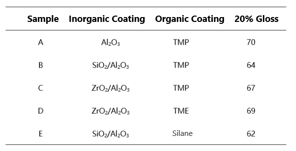 It can be seen from table 2 that the gloss of the paint film will be different with different coated titanium dioxide. At present, the domestic technology of dense silicon coating is not mature, so the gloss of silicon aluminum coating products is lower than that of zirconium aluminum products.