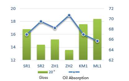 From Figure 2, titanium dioxide has a high oil absorption, and the film gloss is relatively low in solvent based coatings. The oil absorption affects the smoothness of the film surface, resulting in a decrease in gloss.