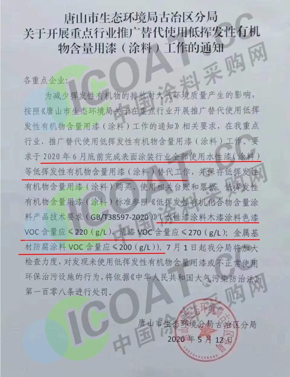 为减少挥发性有机物的排放对大气环境质量产生的影响,按照《唐山市生态环境局关于在重点行业开展推广替代使用低挥发性有机物含量用漆(涂料)工作的通知》相关要求,在我重点行业,推广替代使用低挥发性有机物含量用漆(涂料)工作,要求于2020年6月底前完成表面涂装行业全部使用水性漆(涂料)等低挥发性有机物含量用漆(涂料)替代工作,并保存低挥发性有机物含量用漆(涂料)购买、使用相关台账和票据。低挥发性有机物含量用漆(涂料)标准参照《低挥发性有机化合物含量涂料产品技术要求(GB/T38597-2020)》(水性漆涂料木漆涂料色漆VOC含量应≤220(g/L)、清漆VOC含量应≤270(g/L);金属基材防腐涂料VOC含量应≤200(g/L))。 7月1日起我分局将加大检查力度,对发现未使用低挥发性有机物含量用漆或不正常使用环保治污设施的行为,将依据《中华人民共和国大气污染防治法》第一百零八条进行处罚。附:《中华人民共和国大气污染防治法》第一百零八条 违反本法规定,有下列行为之一的,由县级以上人民政府生态环境主管部门责令改正,处二万元以上二十万元以下的罚款;拒不改正的,责令停产整治:(一)产生含挥发性有机物废气的生产和服务活动,未在密闭空间或者设备中进行,未按照规定安装、使用污染防治设施,或者未采取减少废气排放措施的;(二)工业涂装企业未使用低挥发性有机物含量涂料或者未建立、保存台账的;(三)石油、化工以及其他生产和使用有机溶剂的企业,未采取措施对管道、设备进行日常维护、维修,减少物料泄漏或者对泄漏的物料未及时收集处理的;(四)储油储气库、加油加气站和油罐车、气罐车等,未按照国家有关规定安装并正常使用油气回收装置的;(五)钢铁、建材、有色金属、石油、化工、制药、矿产开采等企业,未采取集中收集处理、密闭、围挡、遮盖、清扫、洒水等措施,控制、减少粉尘和气态污染物排放的;(六)工业生产、垃圾填埋或者其他活动中产生的可燃性气体未回收利用,不具备回收利用条件未进行防治污染处理,或者可燃性气体回收利用装置不能正常作业,未及时修复或者更新的。(本文部分内容来源于唐山市生态环境局古冶区分局,中国人大网等,由涂料采购网整理发布,转载请注明出处,如未经许可或未注明出处,将追究法律责任。)