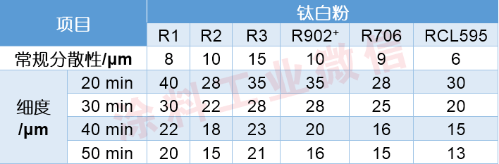 2.1高速分散实验结果油分散性是指钛白粉在应用的树脂体系中能够分散开并能持续稳定的能力,表征钛白粉在机械等外力存在时,能够在树脂体系中分散的难易程度[2]。油分散性指标表征了钛白粉在涂料中的存在状态,只有呈现好的分散性能,才能体现钛白粉的其他性能。本文采用QSJ高速分散机,1 500 r/min进行试验。采用人工刮细度法测定高速分散后涂料的细度,结果见表3。