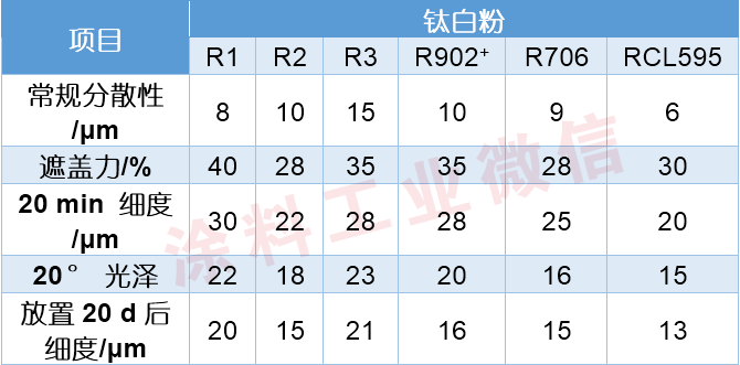 表4不同牌号钛白粉对丙烯酸体系涂料中各指标的结果