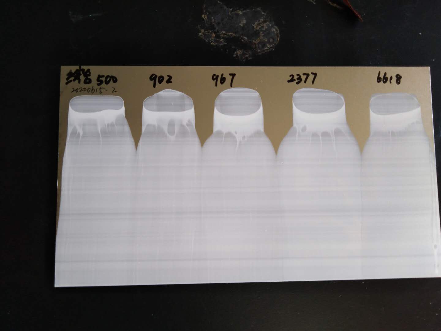 2.2振动混合头验结果分散稳定性主要表征钛白粉与树脂的相容性,相似相容或通过化学键链接,使钛白粉均匀地分散在介质体系中,保持漆料稳定的性能。