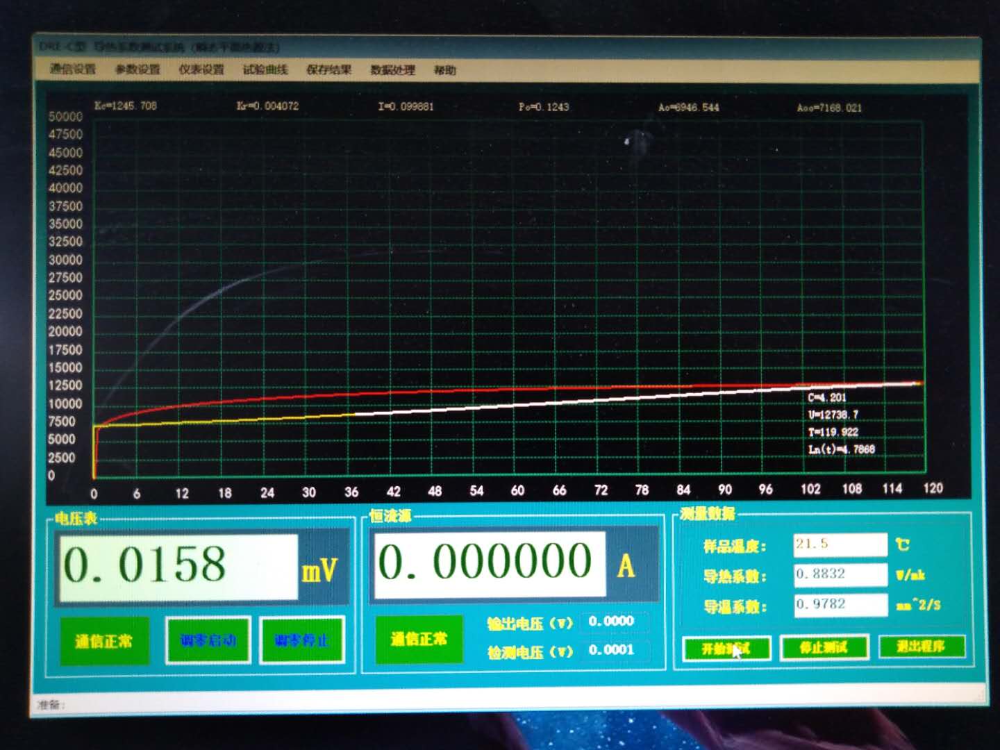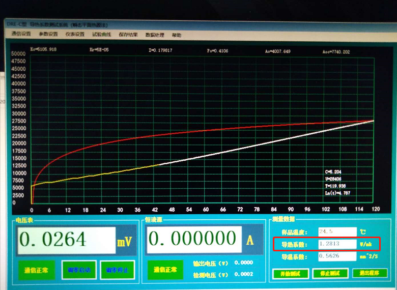 将未添加1项原料,打版成对照版A,将添加1项原料,打版成考察版B,用DRE-III型导热系数测试仪进行测试,调整电流为0.12A,分别对A、B两块样进行测试。