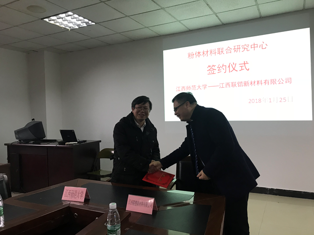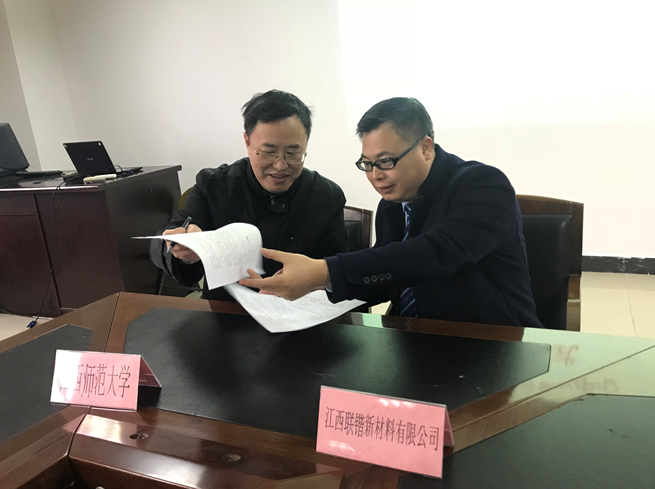 2018年1月25日,江西师大与江西联锴新材料有限公司成立粉体材料联合研究中心(以下简称研究中心)签约仪式在校举行。陈运平副校长和科技处王涛处长出席了签约仪式,仪式由化学化工学院党委书记熊琍琍主持。