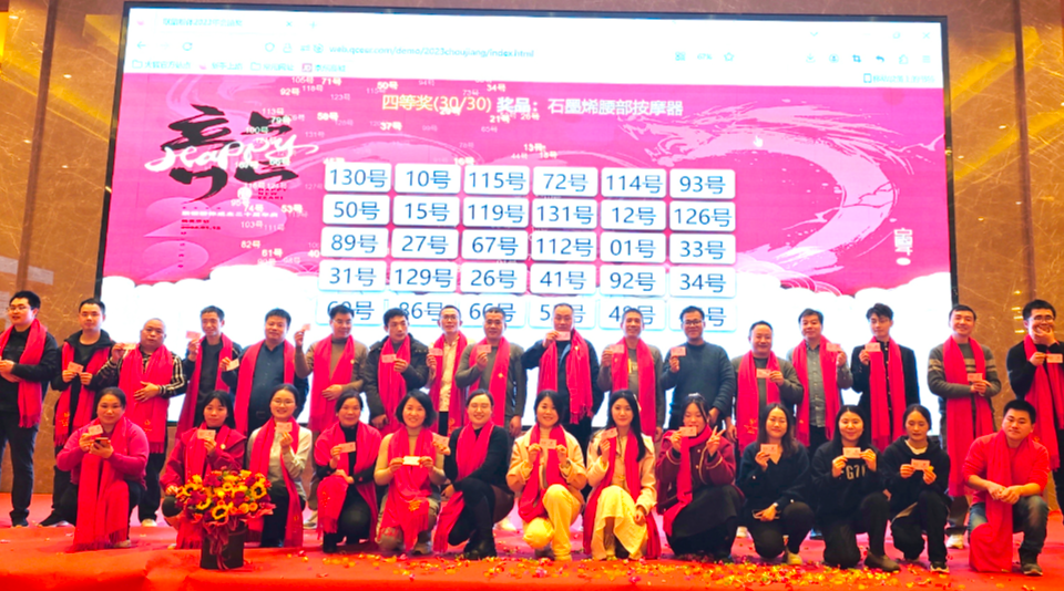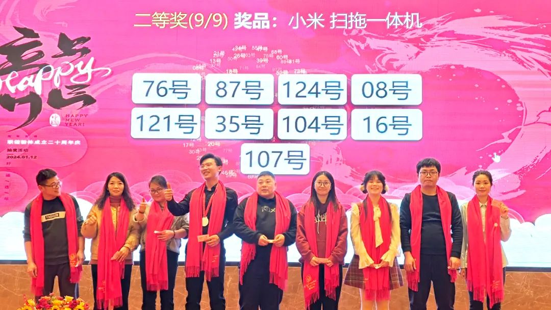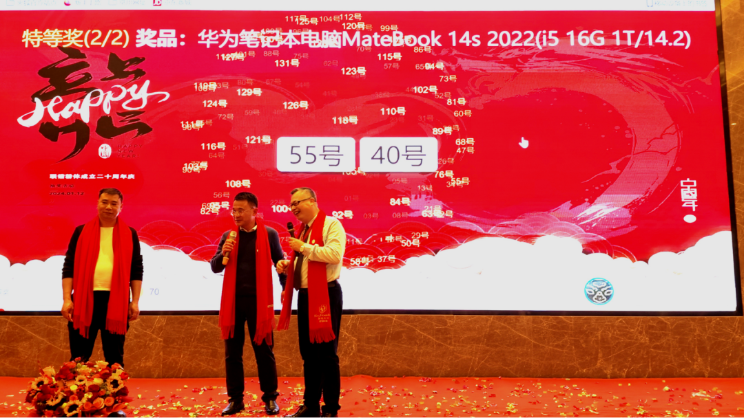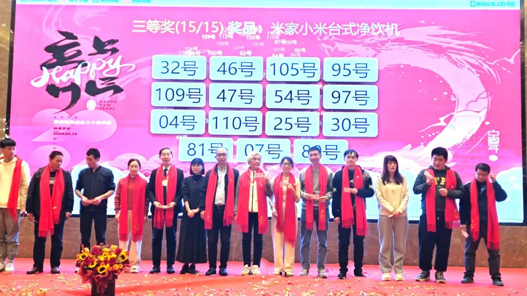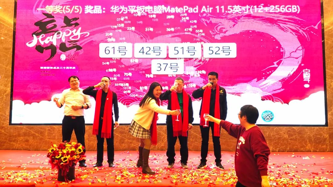 在20周年庆典的晚会上,美酒与佳肴相伴,当然少不了激动人心的抽奖环节!一轮接一轮的抽奖活动,迅速点燃了年会的气氛,将现场的欢庆推向高潮。在此,我们衷心祝贺所有中奖的幸运儿,愿新的一年里,大家龙腾虎跃、精神焕发、事事如意!